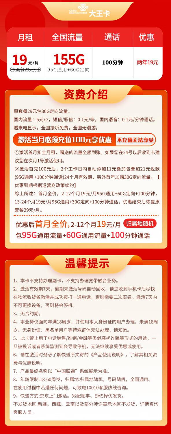 套餐介绍:充值100元享首月全价,2-24个月19元月租,归属地随机~